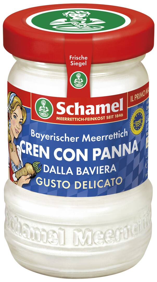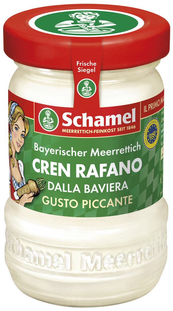 100% rafano bavarese raccolto a mano, finemente grattugiato fresco con aggiunta di panna per un gusto delicatamente saporito. Una salsa Cren ideale con speck, salumi e pesce.