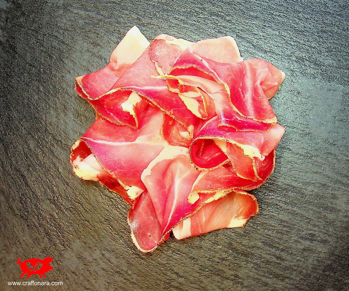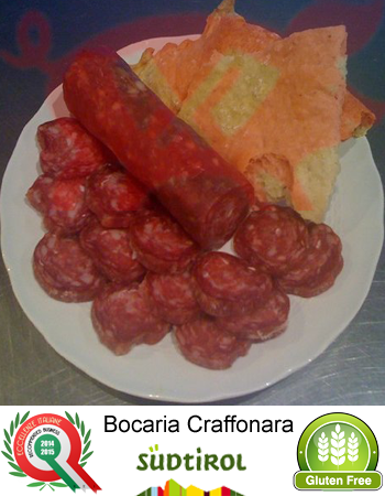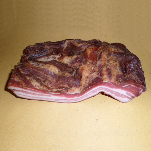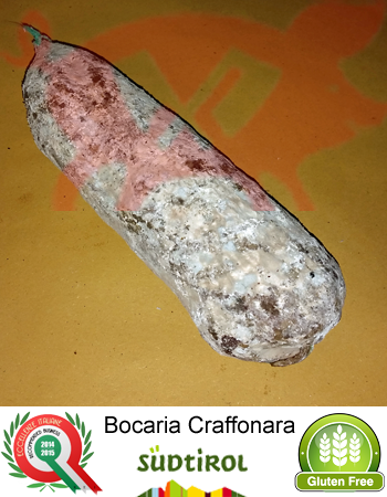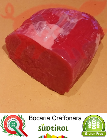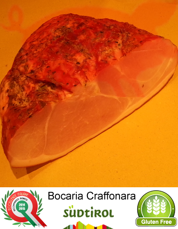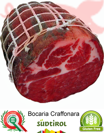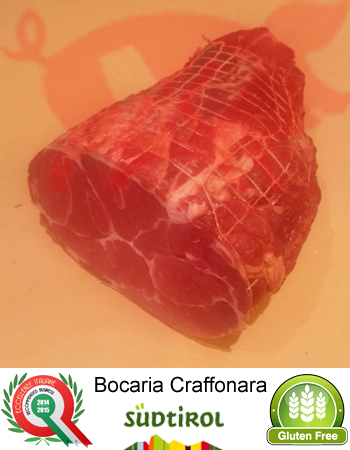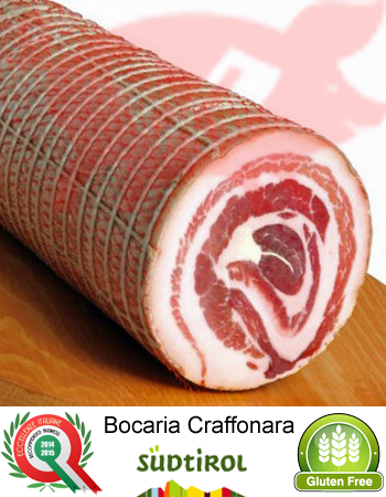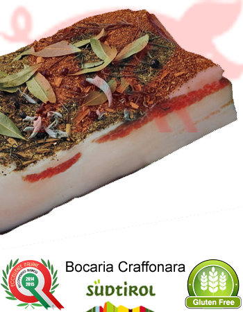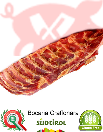 Lo speck é sicuramente il prodotto piú conosciuto dell' Alto Adige, viene prodotto con la coscia di suino disossata. Il nostro speck ha un sapore delicato e non é troppo affumicato. Non contiene allergeni alimentari. La stagionatura é di ca. 6 mesi.
